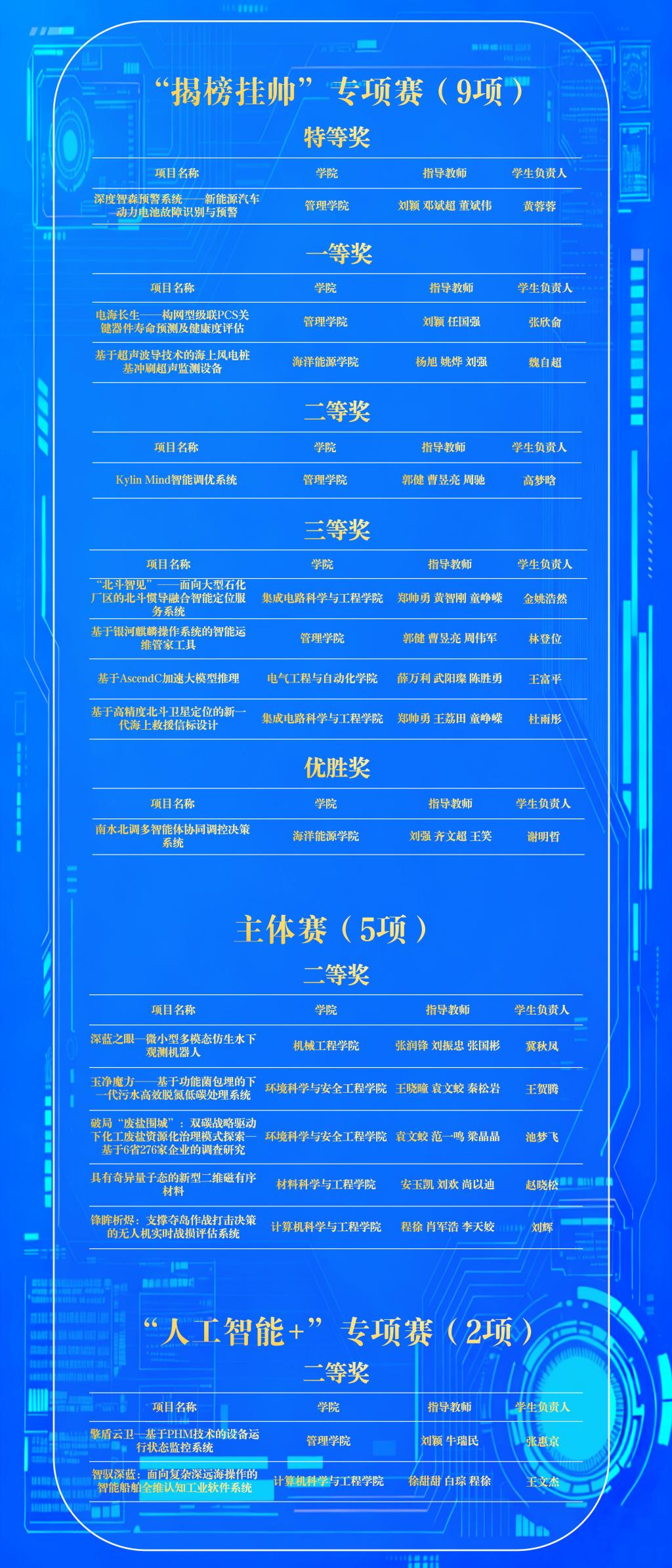 11月4日,第十九届“挑战杯”中国移动全国大学生课外学术科技作品竞赛在南京大学圆满落下帷幕。我校在本届竞赛中共荣获16项国家级奖项。其中“揭榜挂帅”专项赛中特等奖1项、一等奖2项、二等奖1项、三等奖4项、优胜奖1项;主体赛二等奖5项;“人工智能+”专项赛二等奖2项。获奖数量创历年参赛成绩新高,竞赛成绩位于天津市属院校首位。