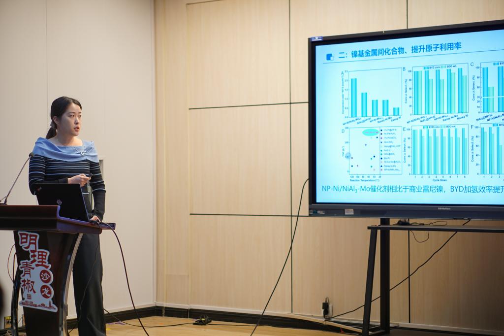 李红作“镍基加氢催化剂的创新与应用”的报告。她介绍了具有不同孔结构的纳米多孔镍基催化剂的制备与其成型技术,探讨了这些催化剂在精细化学品合成中用于选择性加氢反应的应用。