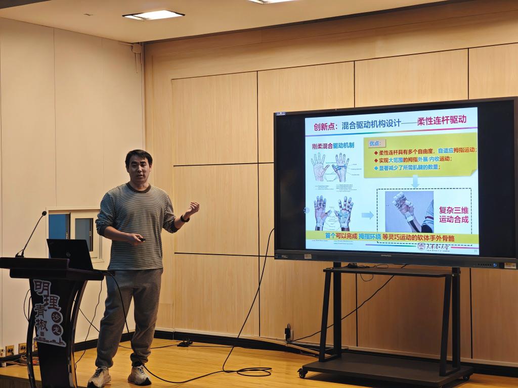 陈文远作“手外骨骼机器人设计与控制”的报告。他系统探究了手外骨骼机器人的设计、意图识别与智能控制方法。该机器人通过对偏瘫患者的临床测试,验证了其在提升患者生活水平方面的有效性。