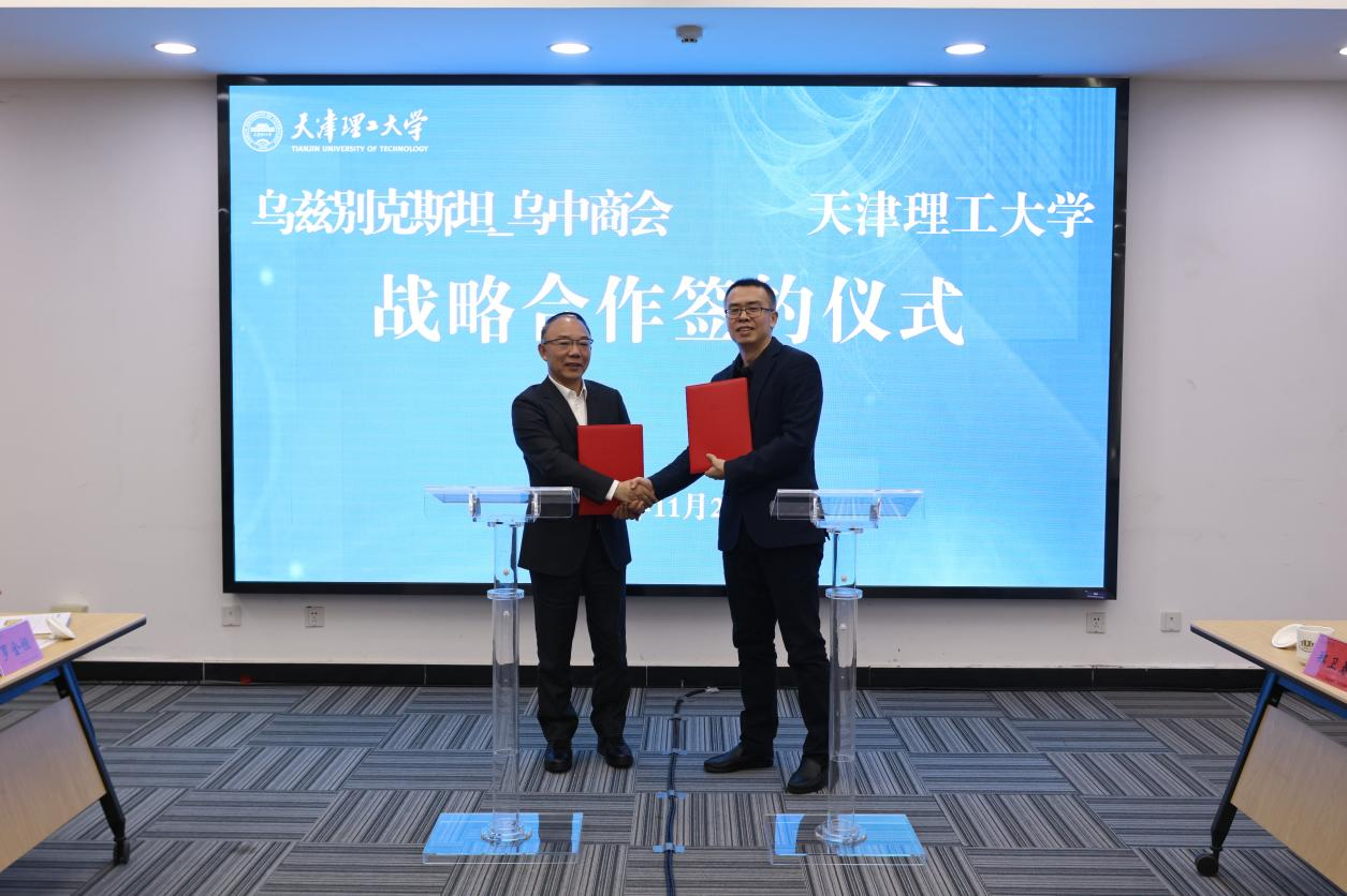 11月26日,学校与乌兹别克斯坦_乌中商会举行战略协议签约仪式。乌中商会会长杨波,党委常委、副校长王铁出席签约仪式。