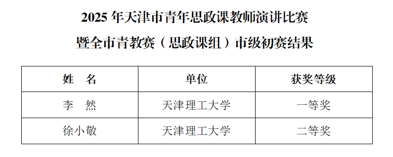 近日,天津市教育两委公布了2025年度天津市青年思政课教师演讲比赛暨全市“青教赛”(思政课组)市级初赛结果,我校马克思主义学院教师李然、徐小敬分别斩获一等奖、二等奖,入围参加市级决赛。