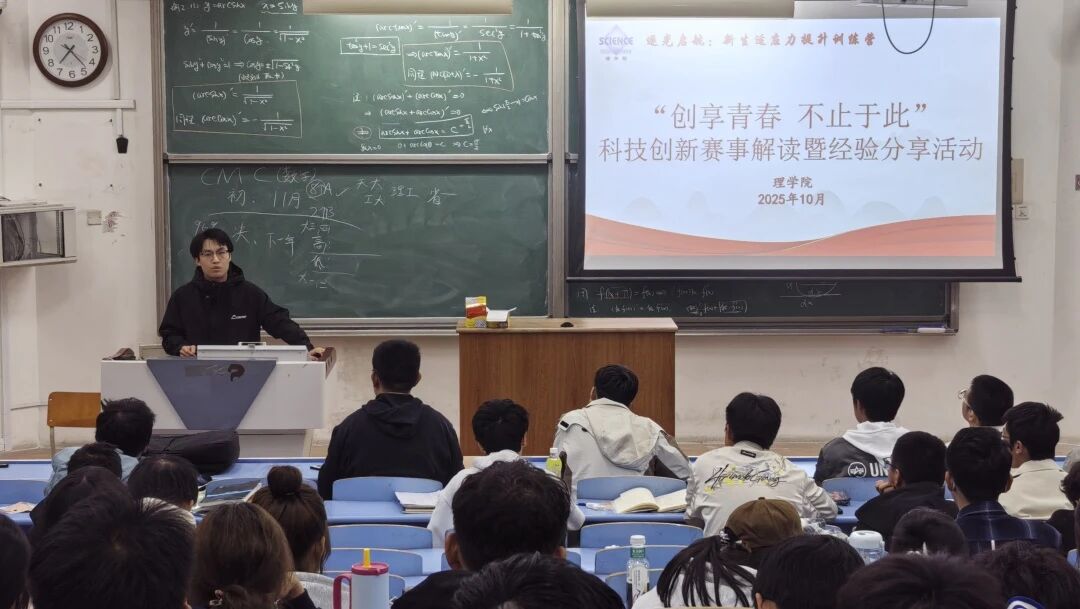 近日,理学院开展科技创新赛事解读暨经验分享活动。本次活动由2022级应用物理学专业学生马富祥、2022级数学与应用数学专业学生徐杨智和2023级数学与应用数学专业学生赵嘉璇担任主讲嘉宾。