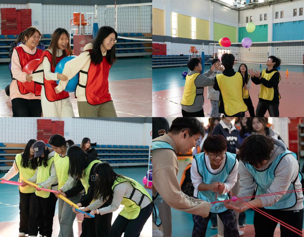 活动现场,同学们身着不同颜色队服,共同完成“同心协力”“珠行万里”“不倒气球”等多个趣味项目,气氛热烈融洽。