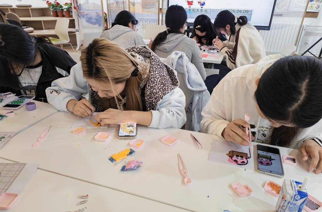活动中,主持人介绍了拼豆制作的基本方法与注意事项,并解答了同学们的疑问。随后,大家挑选心仪的色彩,在模板上精心组合,逐步拼出花草、动物、校园景观等生动图案。同学们在动手过程中专注投入、互相交流,现场氛围轻松融洽。大家在手工创作中体验乐趣,有效舒缓了情绪、释放了压力。