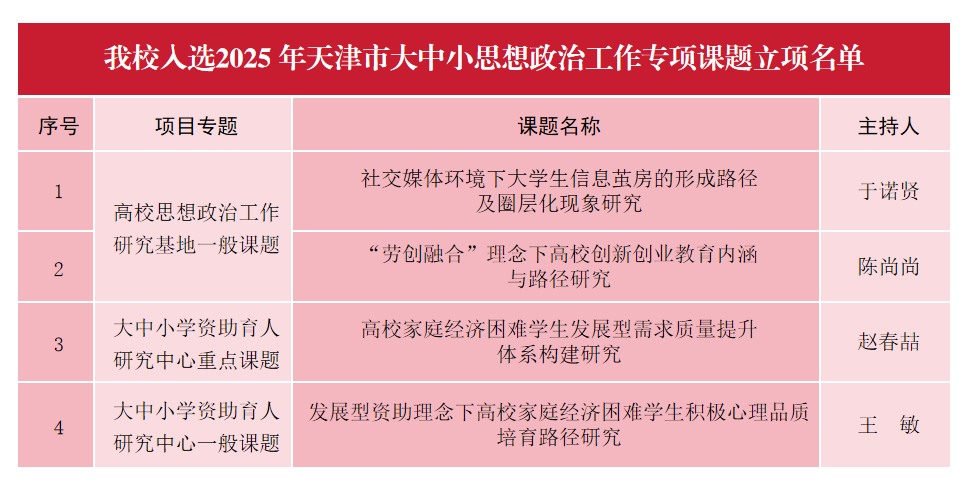 在2025年获批立项的187项天津市大中小思想政治工作专项课题中,我校共获批课题4项,其中重点课题1项,一般课题3项。
