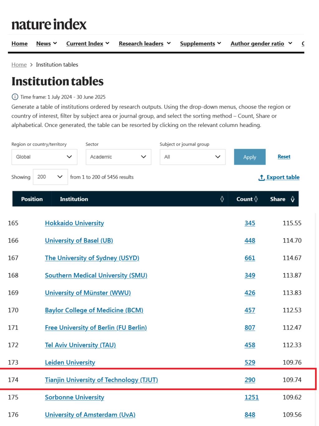 日前,自然指数官网(https://www.nature.com/nature-index/)发布了最新一期自然指数排名(数据统计范围2024年7月1日至2025年6月30日),我校整体自然指数排名进一步跃升,进入全球科研机构前200行列,位列全球高校第174名。数据显示,在中国内地高校中,我校自然科学综合排名第68位,相比2024年提升19个名次,其中化学学科表现最为突出,位列内地高校第50位。自然指数排名的稳步攀升,不仅是学校科研全球影响力不断增强的直观体现,更清晰反映出近年来学校学科建设和基础理论研究领域取得的显著进步与丰硕成果。
