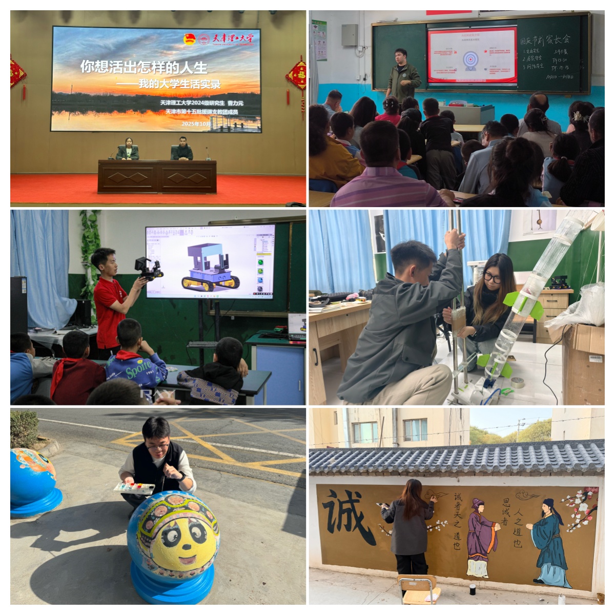 支教团深入拓展第二课堂,面向高中生举办主题报告,分享成长经历,激励学生树立远大理想;组织并参与学生家长会,助力家校共育;在行知小学设计制作“科技角”展区,联合开展首届科技节活动,通过制作三级推进水火箭发射装置、3D建模多功能遥控履带车等,激发学生的科学兴趣;在艺术创作中,师生共同绘制京剧脸谱、主题墙绘,将校园打造为民族团结的生动课堂。