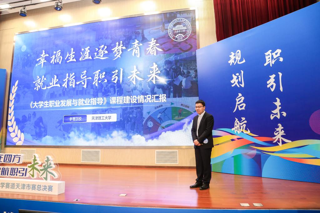 在总决赛中,我校教师简皓以“幸福生涯筑梦青春,就业指导职引未来”为主题,从课程理念、教学模式、教学内容与方法、资源平台建设等方面,系统介绍了学校《大学生职业发展与就业指导》课程建设路径,并进行现场模拟授课,充分展示了学校在该课程建设中形成的鲜明价值引领、教学创新设计和扎实育人成效。