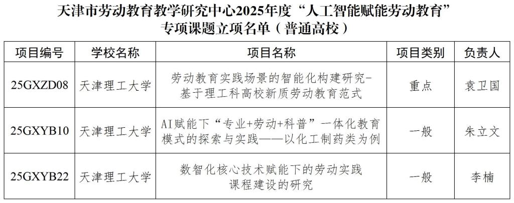 日前,天津市劳动教育教学研究中心公布了2025年度“人工智能赋能劳动教育”专项课题立项名单。本次共立项普通高校重点课题11项、一般课题48项。我校获批重点课题1项、一般课题2项。