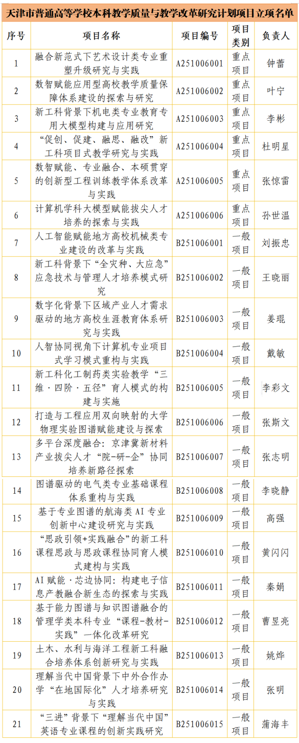 近日,天津市教育委员会公布了2025年天津市普通高等学校本科教学质量与教学改革研究计划项目立项名单,学校共有21个项目获批,其中重点项目6项、一般项目15项,立项数量与质量稳步提升。获批项目紧密对接产业变革与教育发展前沿,聚焦“新工科”建设、数智赋能、学科交叉、产教融合等重点方向,涵盖专业与课程建设、项目式教学、教学体系改革、人才培养模式创新、思政育人等内容,体现了学校教学改革实践的广度与深度。