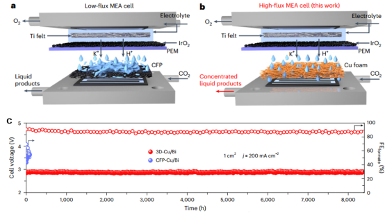 针对这一前沿问题,该研究提出采用高通量泡沫铜作为催化剂载体,利用其丰富且贯通的三维大孔道结构,为液体产物提供高效传质通道,强化产物从催化剂表面的快速脱附与定向转移,从而实现甲酸盐液体产物的高浓度、长时间连续制备。以Cu/Bi核壳纳米线作为催化剂,在仅通入干燥CO2、不加阴极电解液、电流密度为200mA/cm2的条件下,电解槽能够在长达8000小时连续产生4.5mol/L的甲酸盐,且法拉第效率始终维持在90%左右,该性能达到当前文献报道的最高水平。为进一步验证应用潜力,本研究将电解槽拓展至100cm2大尺寸电解槽,催化体系仍保持优异的催化活性与稳定性,为后续工业化奠定了坚实基础。该技术目前正与中国石油兰州石化公司开展中试实验。