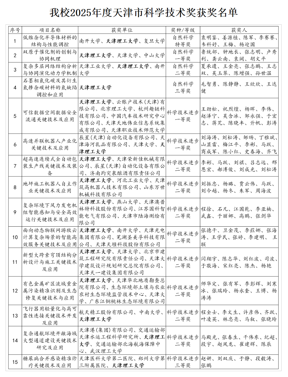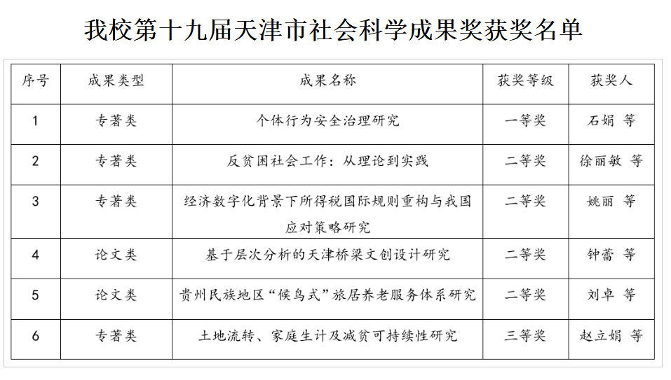 近日,第十九届天津市社会科学成果奖、2025年度天津市科学技术奖评选结果相继揭晓。我校6项成果荣获天津市社会科学成果奖,其中,一等奖1项、二等奖4项、三等奖1项。我校主持或参与完成的15项科技成果获得天津市科学技术奖励,其中,作为第一完成单位获得一等奖2项、二等奖6项、三等奖1项;作为参与完成单位获得特等奖1项、一等奖1项、二等奖3项、三等奖1项。