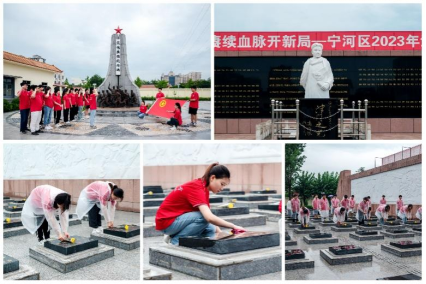 在宁河区烈士陵园于方舟烈士雕像前,实践团成员重温入团誓词,并擦拭烈士墓碑、向烈士敬献鲜花。