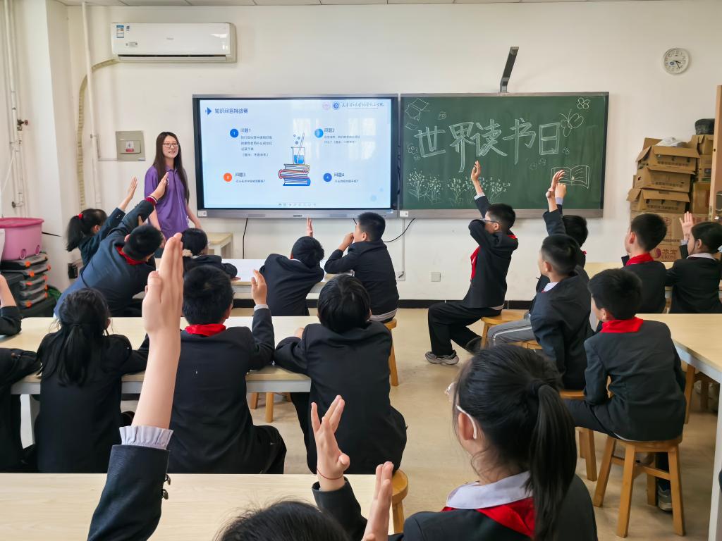 志愿者结合科普读物,用生动通俗的语言讲解生活中的化学知识,并围绕“大自然为什么是彩色的”“阳光会画画吗”等趣味问题与同学们互动问答。现场气氛活跃,同学们踊跃发言,在轻松的氛围中感受阅读与科学结合的乐趣。