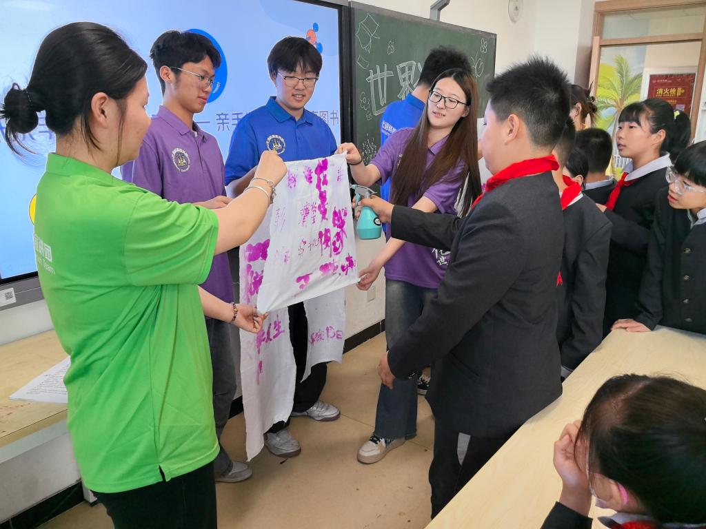 实践环节,志愿者带领同学们体验“蓝晒魔法”“无字天书”“古法造纸”三项趣味实验。在“蓝晒魔法”中,同学们利用日光成像原理制作了植物书签;在“无字天书”实验中,同学们通过酚酞与碱性溶液反应,让隐藏的字迹神奇显现;在“古法造纸”环节,同学们动手制作再生纸,并将其装订成班级共享图书,在实践中感悟环保与循环利用的意义。
